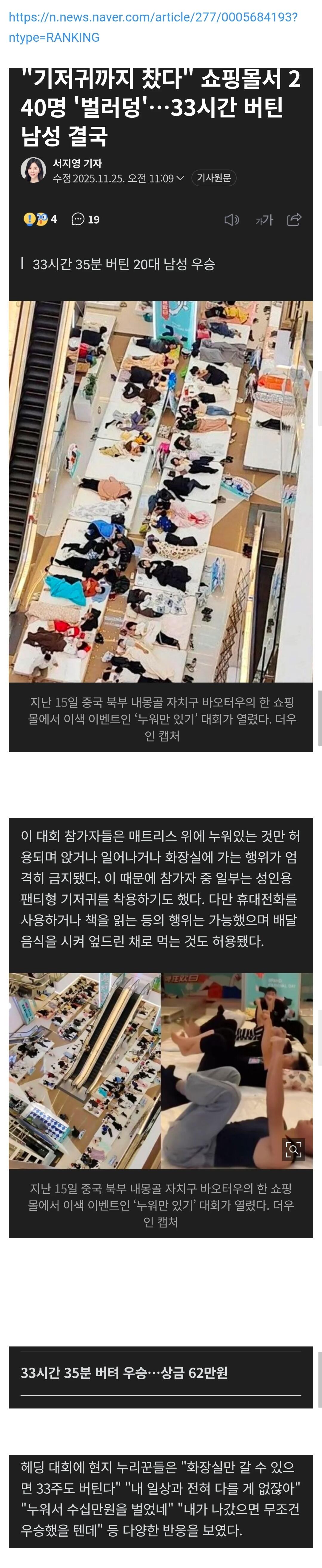 '누워만 있기' 대회 33시간 우승 작성자 정보 최고관리자 작성일 11.26 01:01 컨텐츠 정보 103 조회 0 댓글 0 추천 0 비추천 목록 0 추천 추천 비추천 0 비추천 댓글 로그인한 회원만 댓글 등록이 가능합니다. 이전 다음 목록
