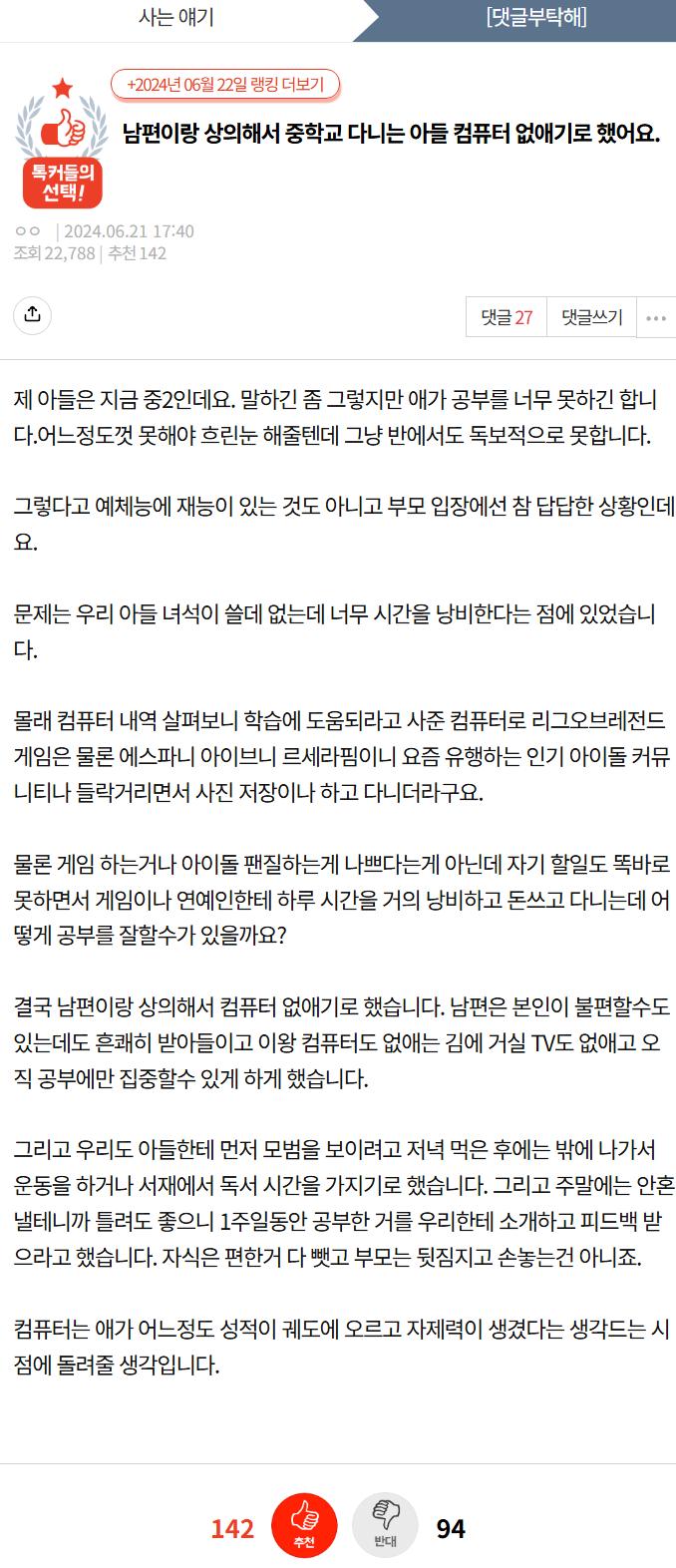 중학교 다니는 아들 컴퓨터를 없애버렸어요