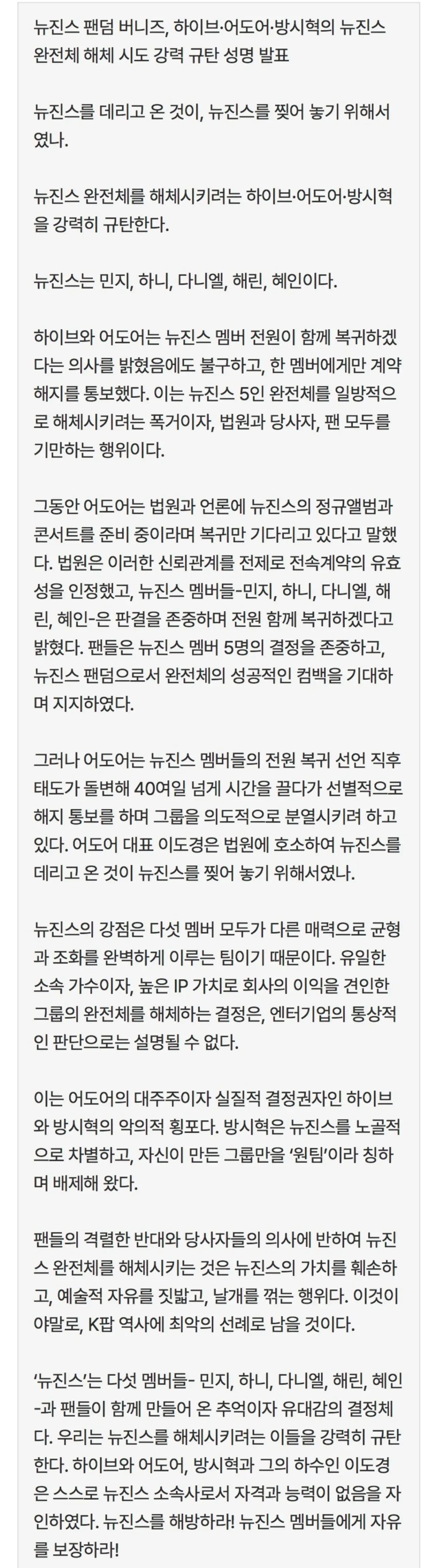 뉴진스의 팬덤 ‘버니즈’가 멤버 다니엘의 전속계약 해지 및 팀 퇴출 소식에 대해 하이브와 어도어를 강력히 비판하며 공식 성명서를 발표했다. 팬들은 29일 발표한 성명서에서 이번 사태를 “뉴진스를 의도적으로 해체시키려는 악의적 횡포”로 규정하고 모든 수단을 동원해 대응할 것임을 선언했다.